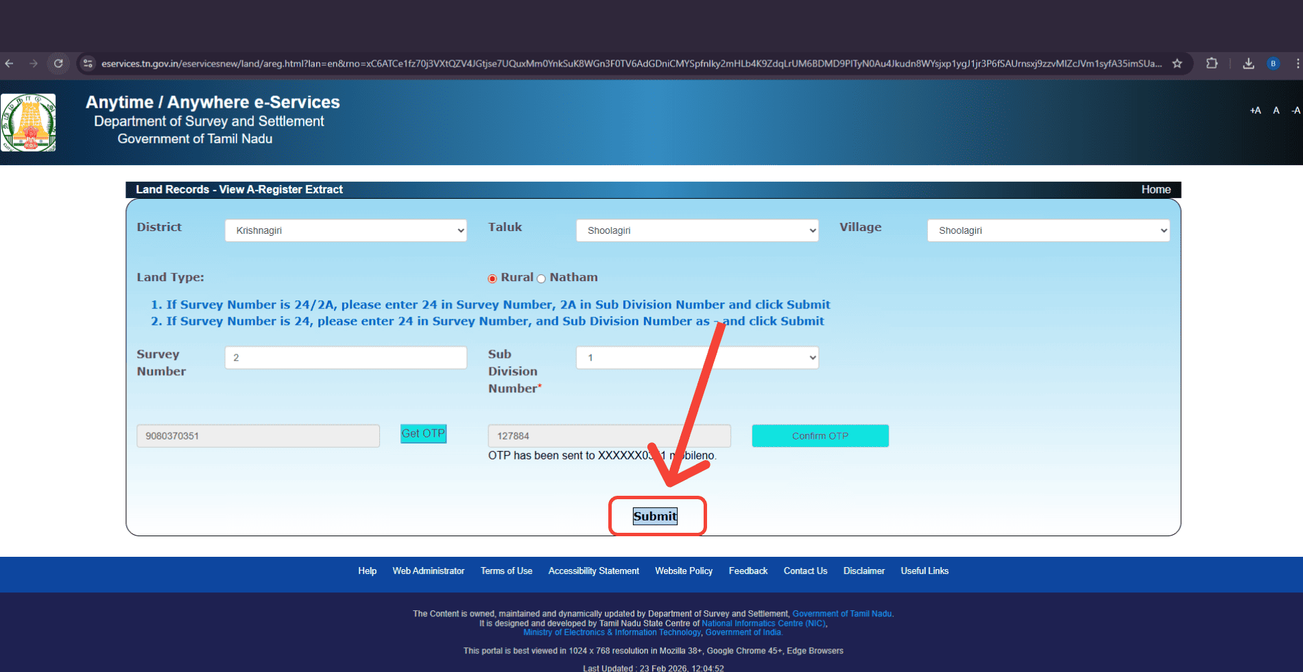 District, Taluk, Village, Survey Number, Subdivision Number, and mobile OTP verification.