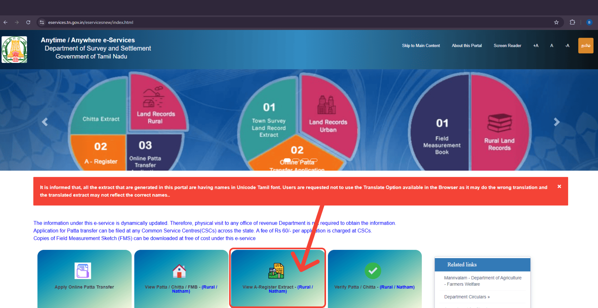 The Tamil Nadu Government provides online access to A-Register extracts through the official e-Services portal.